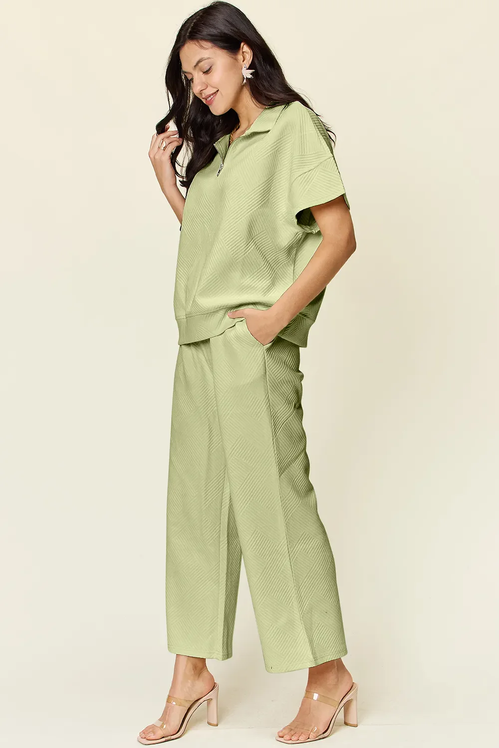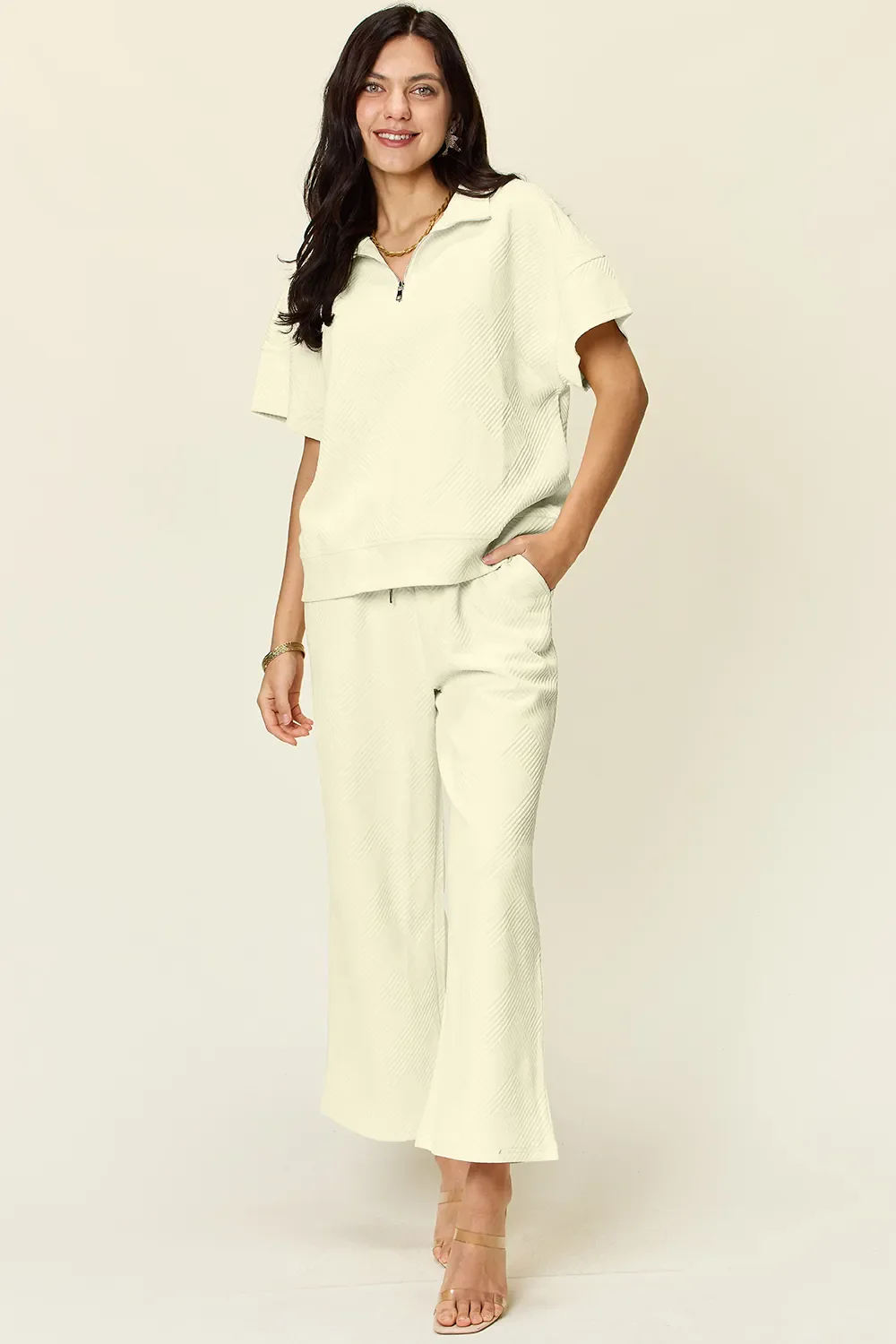 Double Take Full Size Texture Half Zip Short Sleeve Top and Pants Set