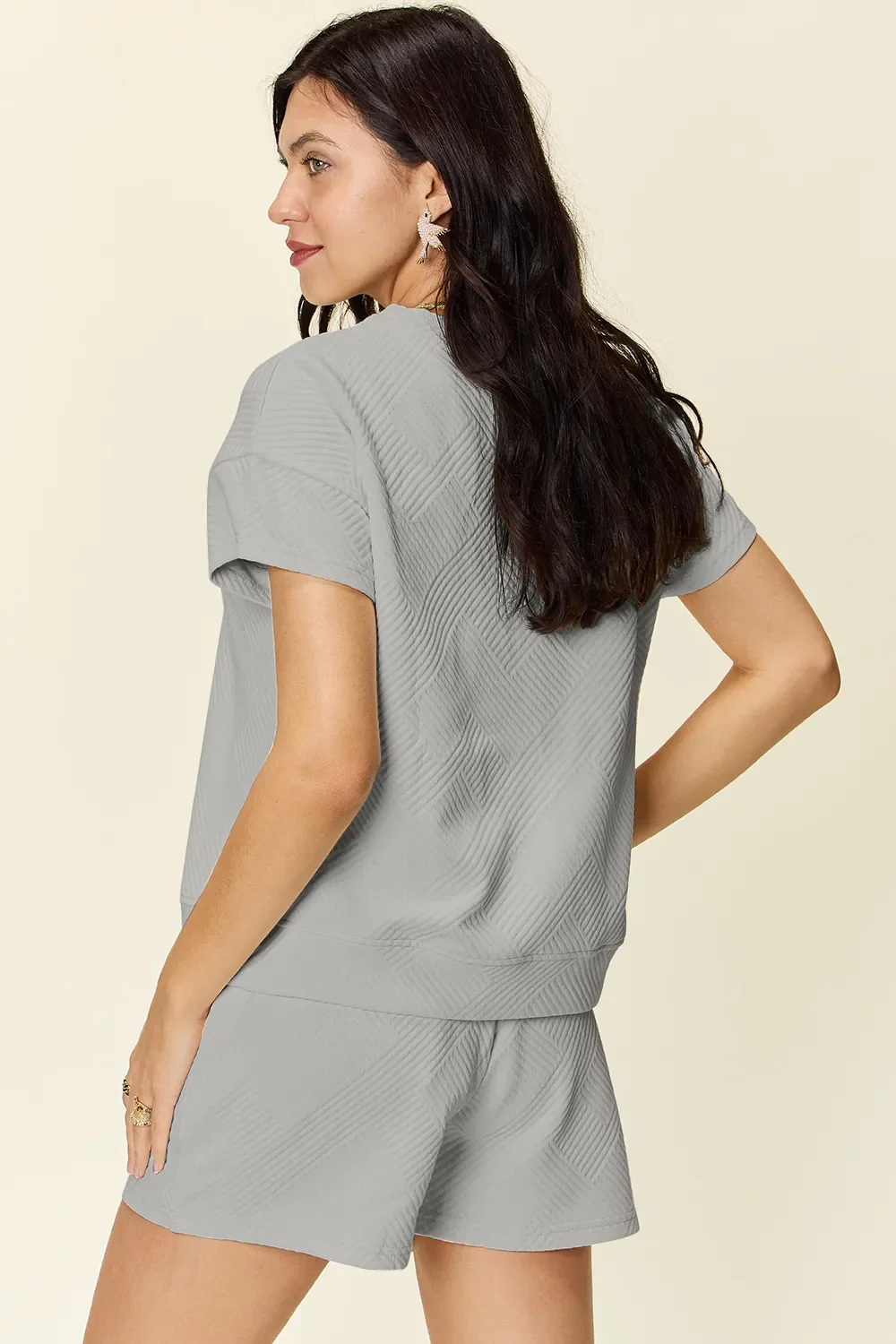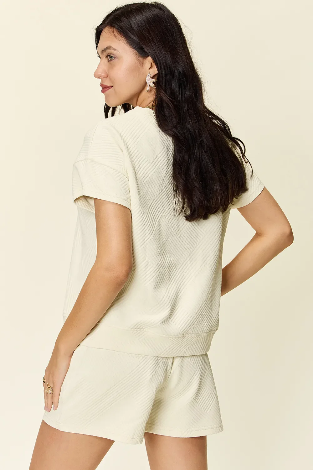 Double Take Full Size Texture Short Sleeve T-Shirt and Drawstring Shorts Set