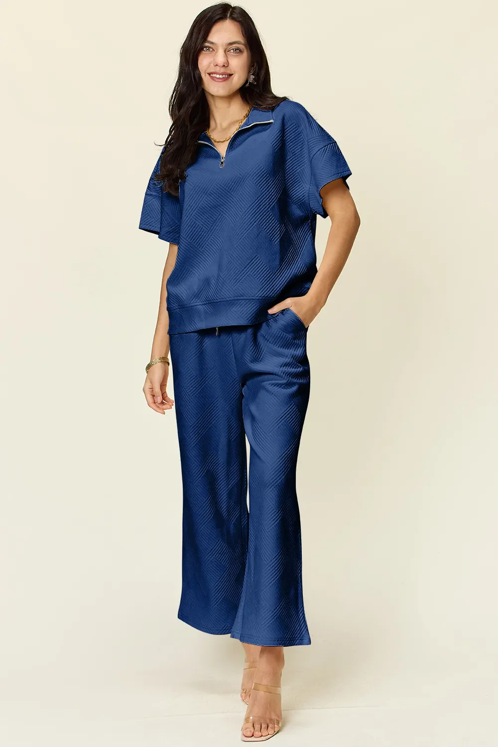 Double Take Full Size Texture Half Zip Short Sleeve Top and Pants Set