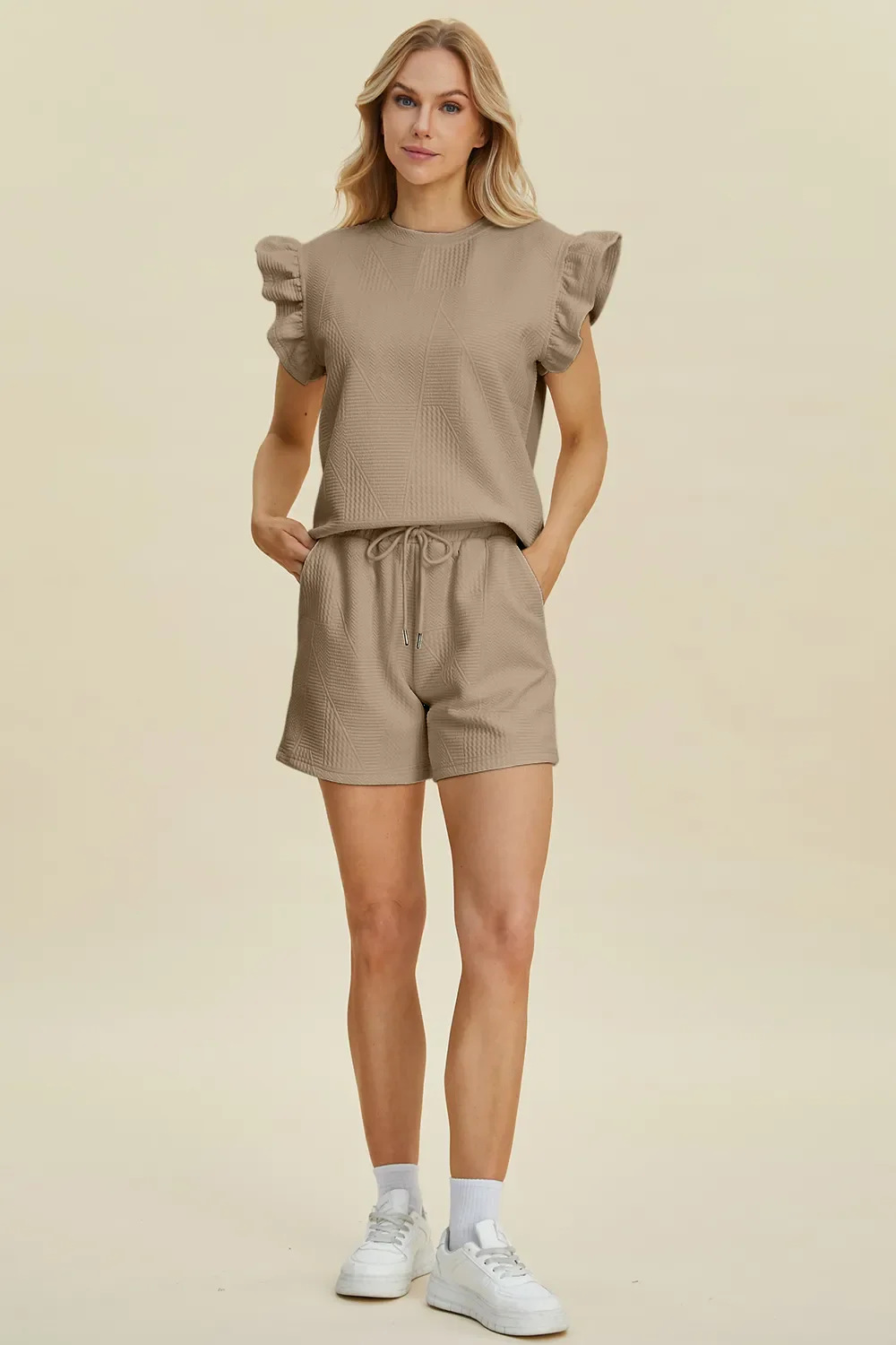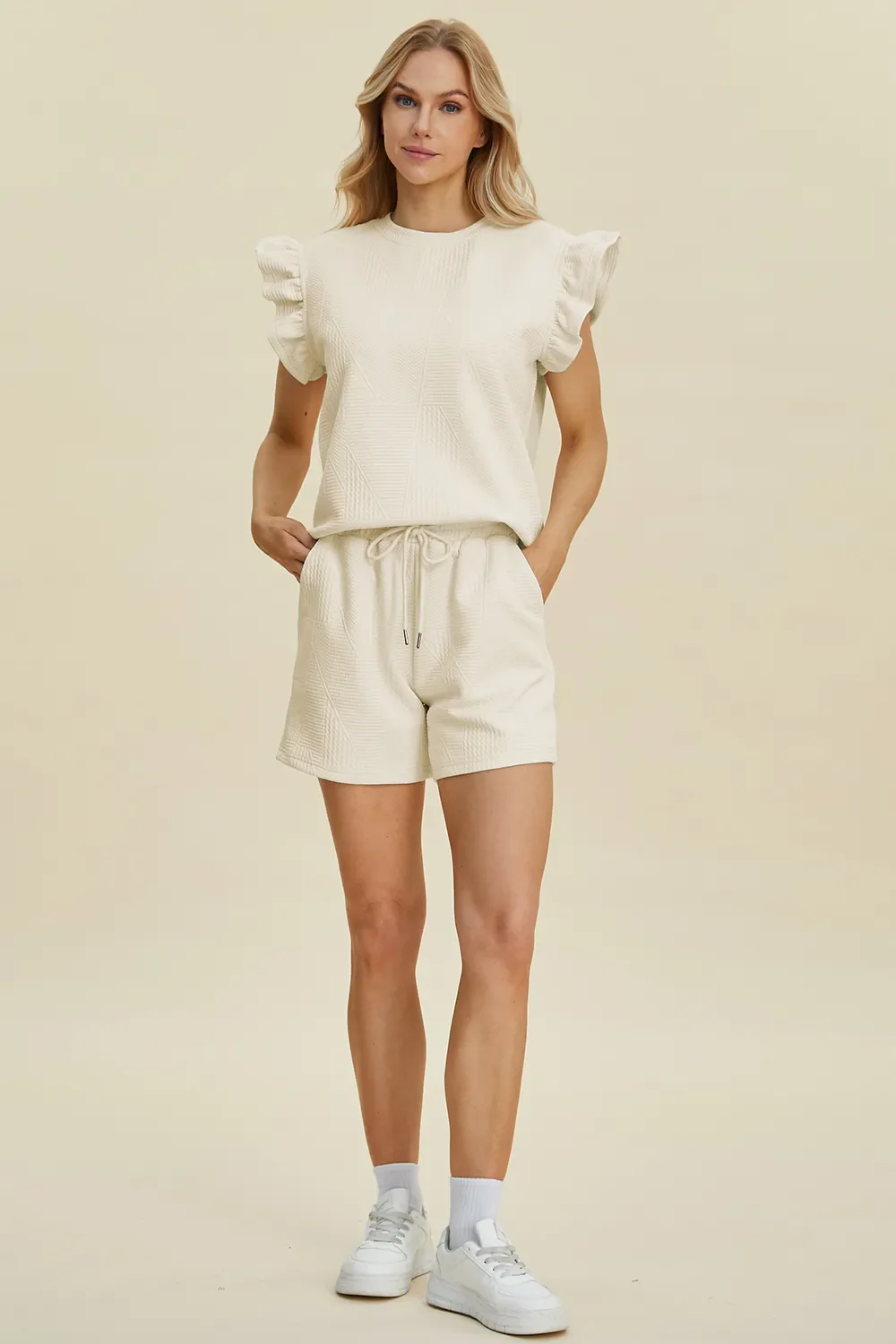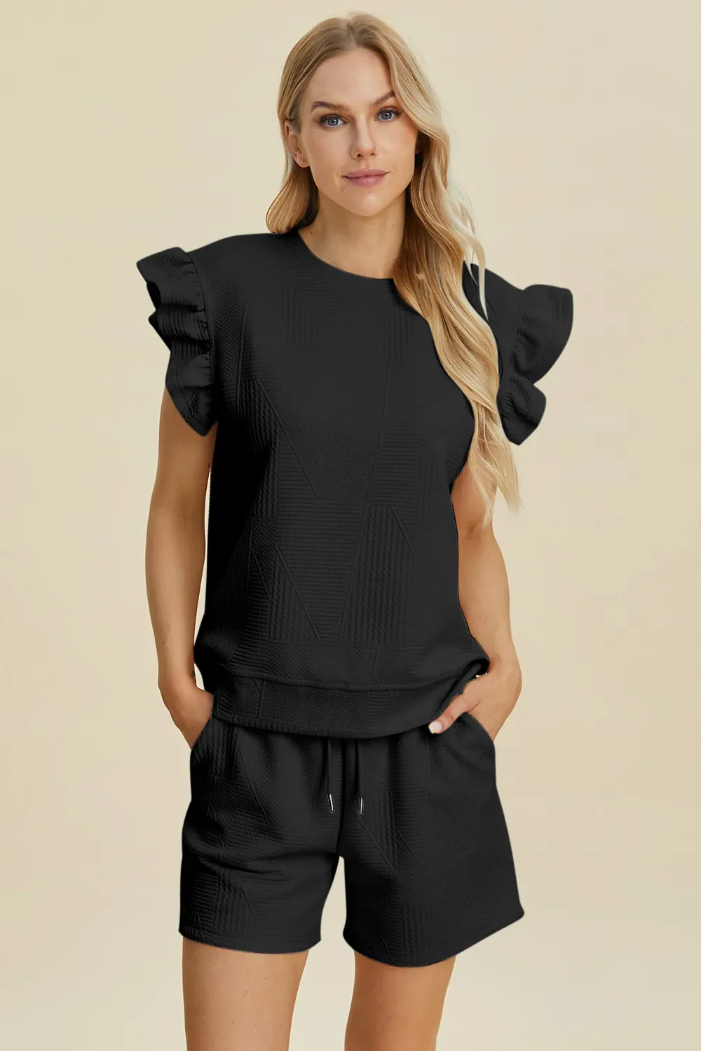 Double Take Full Size Texture Round Neck Ruffle Sleeve Top and Shorts Set